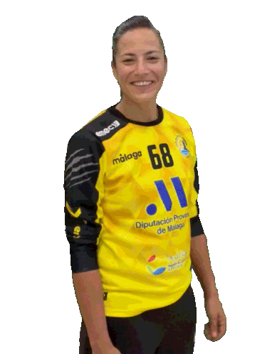 Virginia Fernández, a handball player, celebrates in her yellow jersey with number 68, representing Málaga.