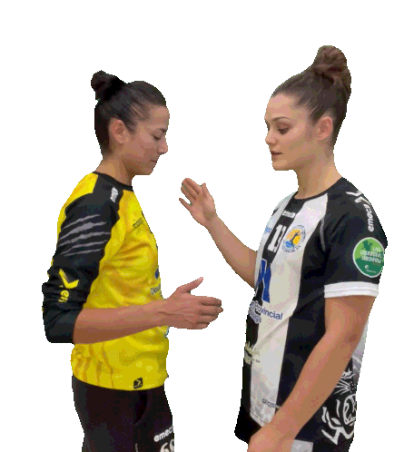 Handball players Virginia Fernández and Elena Cuadrado perform a synchronized gesture, touching fingertips then raising hands.