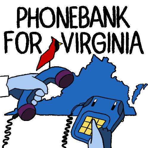 Animated sticker encouraging phonebanking for Virginia, featuring a map, phones, and a cardinal bird.