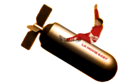 Juanfran, dressed in red, flies through the air on a golden missile with 'LA MOVIE BABY' written on its side.