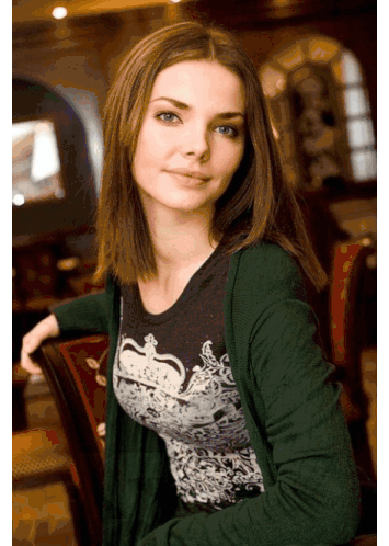 a woman wearing a green cardigan and a black and white shirt with a crown on it