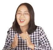 A young woman with glasses and a plaid shirt smiles brightly while clapping her hands enthusiastically.