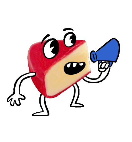 Animated cheese character with a red rind and cartoon features, holding a blue megaphone and shouting, encouraging people to vote.
