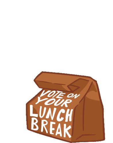 A brown paper lunch bag with 'Vote on Your Lunch Break' becomes a ballot box as a hand casts a ballot.