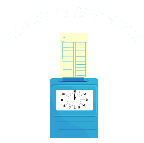 Animated sticker encouraging participation in elections, transitioning from a time clock to a voting booth with an American flag.