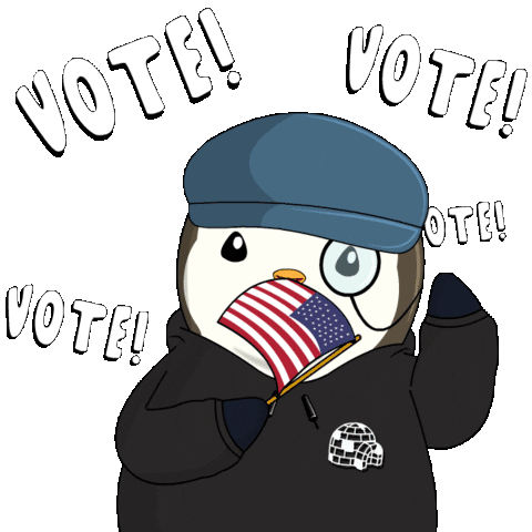 A Pudgy Penguin encourages voting, waving an American flag with "VOTE!" text.