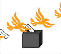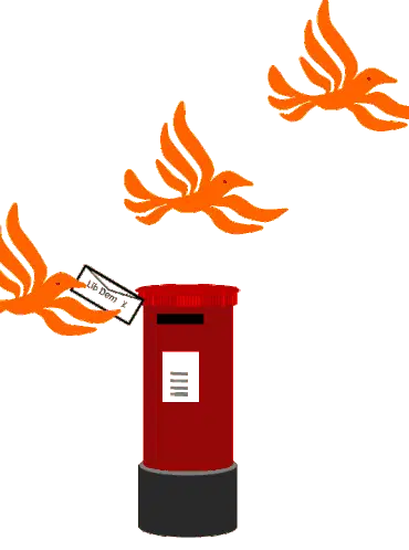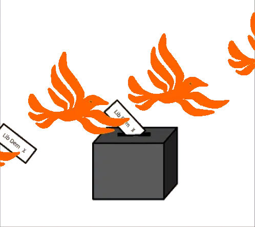 Animated sticker showing orange birds voting for the Liberal Democrats in the UK by dropping ballots into a box.