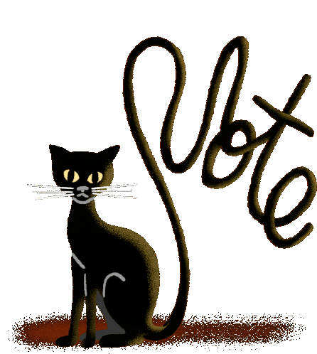 A black cat with glowing eyes sits, its tail forming the word 'Vote' for Halloween and election season.