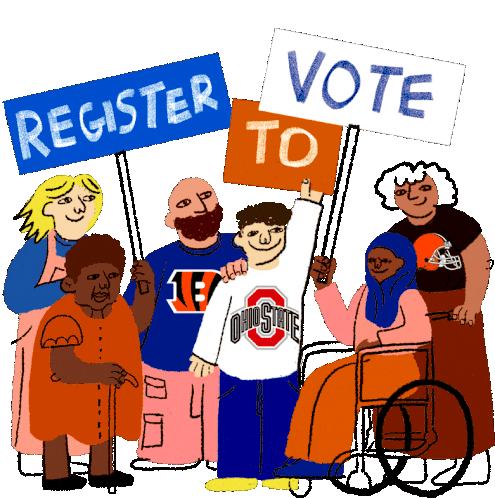 A diverse group of people, including individuals in a wheelchair and with a cane, holding 'Register To Vote' signs, representing Ohio sports teams.