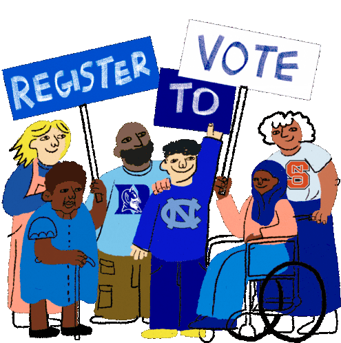 Diverse group of people, including students from Duke, UNC, and NC State, encouraging voter registration and voting.