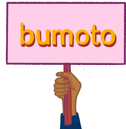A hand holds up a pink sign with the Tagalog word 'bumoto' (vote) in orange letters, encouraging participation in elections.
