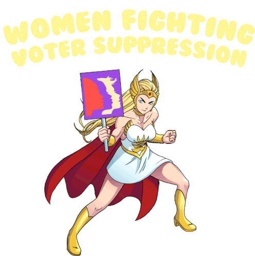 She-Ra, the Princess of Power, stands strong against voter suppression, holding a protest sign with the message 'Women Fighting Voter Suppression'.