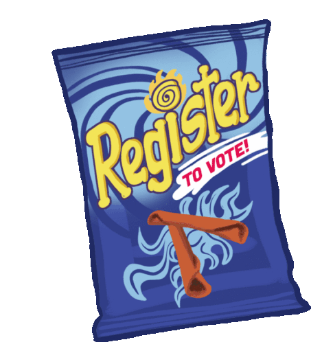 An animated sticker of a blue chip bag, reminiscent of hot chips, with 'Register TO VOTE!' text, encouraging voter registration for elections.