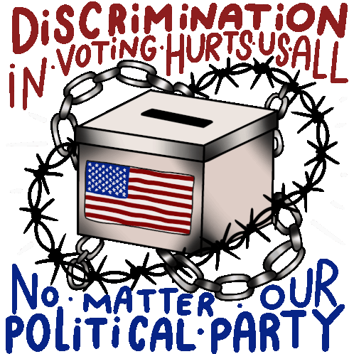 Animated sticker highlighting the impact of voting discrimination, featuring a ballot box with an American flag surrounded by chains and barbed wire.