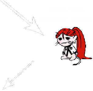 a cat with red hair is looking at a shrimp with an arrow pointing down