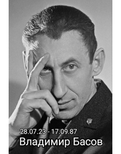 Black and white portrait of Vladimir Basov, a famous Russian actor and director, with his birth and death dates.