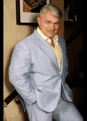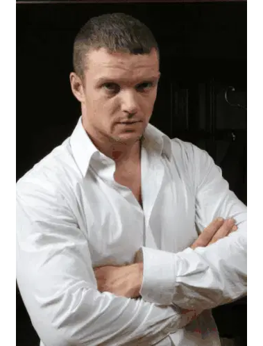 a man in a grey sweater is leaning against a wooden wall with his hands on his hips