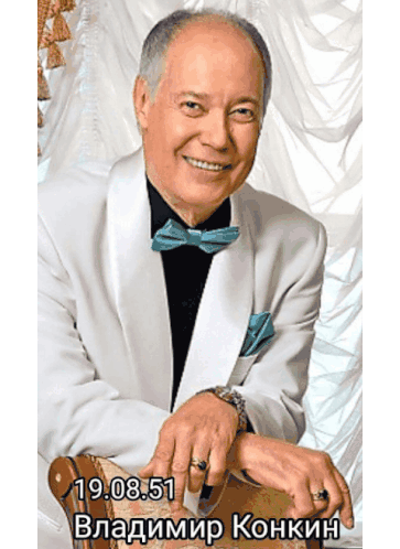 a man in a white suit with a blue bow tie has the date 19.08.05 on the bottom