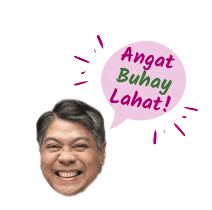 Kiko Pangilinan, a Filipino politician, smiles broadly with a speech bubble saying 'Angat Buhay Lahat!' (Lift Up Everyone's Lives!).