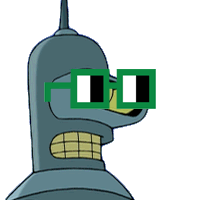 Bender Bending Rodriguez from Futurama sports a pair of stylish, pixelated green square glasses, showcasing his iconic head and smirk.