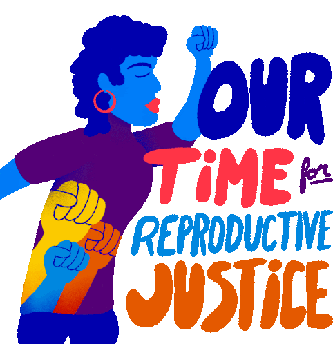 A powerful animated sticker featuring a woman with a raised fist, advocating for reproductive justice. 'Our Time for Reproductive Justice' is displayed.