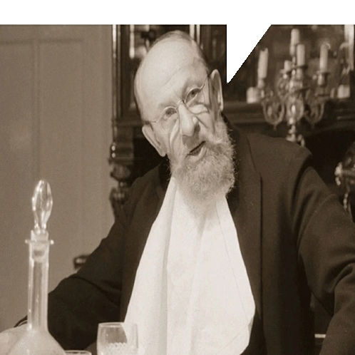 a man with glasses and a beard is sitting at a table with a glass and a decanter