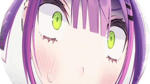 a close up of a girl 's face with green eyes and purple hair