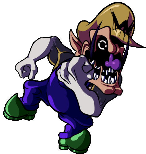 Wario from FNF Mario's Madness striking a right pose, a cartoon character with purple pants and green shoes pointing at the camera.