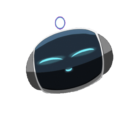 A cute Wabisabip robot head with glowing blue eyes and a happy smile, gently bouncing with a purple ring above.