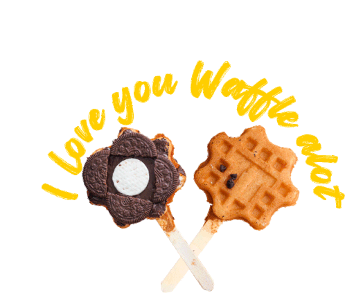 Two delicious waffles on sticks, one chocolate and one plain, with the sweet message 'I Love You Waffle Alot' animated around them.