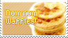 A delicious stack of golden waffles with toppings, featuring 'Nom nom! Waffles!' text in a retro stamp sticker style.