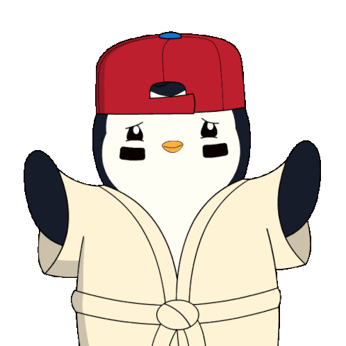 A Pudgy Penguin character, wearing a red cap and a robe, makes a 'wait' or 'hold on' gesture.