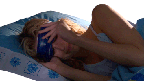 A sleepy woman, possibly Amy, Debs, or Sara Foster, slowly wakes up in bed, adjusting her blue eye mask in the morning light.
