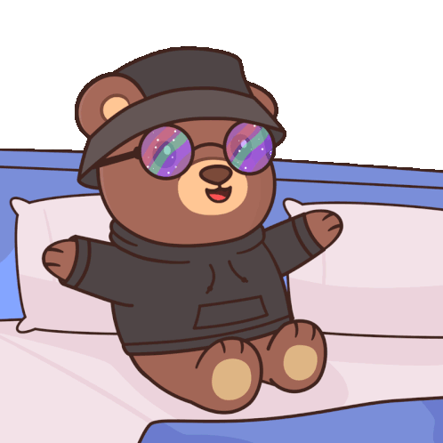 An adorable animated teddy bear, wearing a hat and glasses, happily wakes up and stretches on a cozy bed.