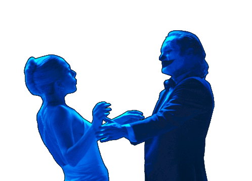 Joaquin Phoenix as Joker and Lady Gaga as Harley Quinn waltz together in a dramatic blue-lit scene from Joker: Folie à Deux.
