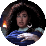 Agatha Harkness from Wandavision makes a funny, surprised face while holding a blue blanket, showing a range of emotions.
