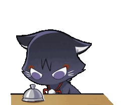 Wanderer, the Genshin Impact character depicted as a black cat, impatiently rings a bell, demanding attention.