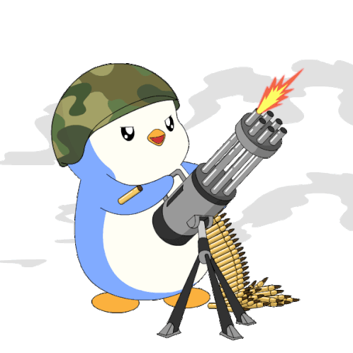 a penguin wearing a helmet is holding a gun