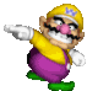 Wario, the iconic Nintendo character, performs a humorous and crude fart, releasing a green cloud in this pixel art sticker.