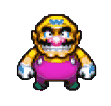 Wario, the iconic Nintendo character, spins around in a pixel art animation, showcasing his full figure.