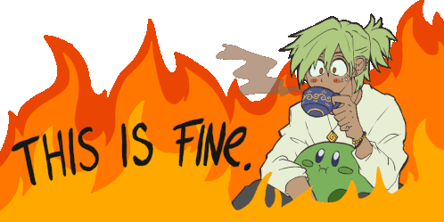 Archy the Warlock from D&D, calmly drinking from a cup with the iconic 'this is fine' meme, perfect for chaotic moments.