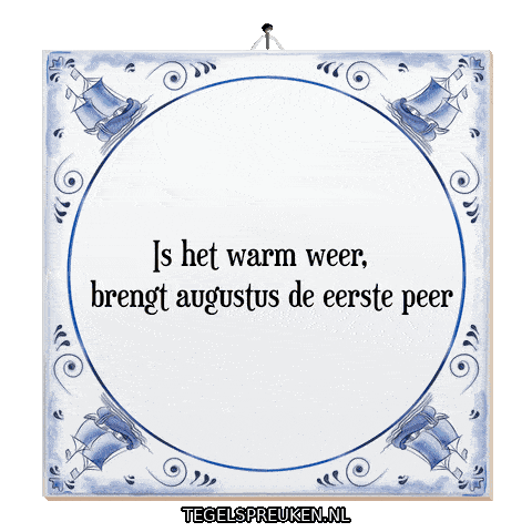 a blue and white tile with the words is het warm weer brengt augustus de eerste peer