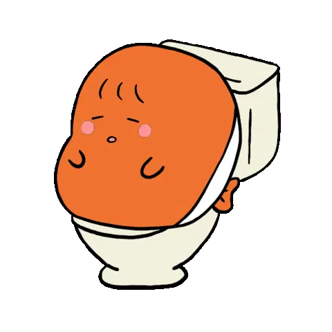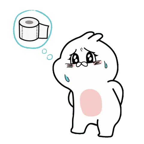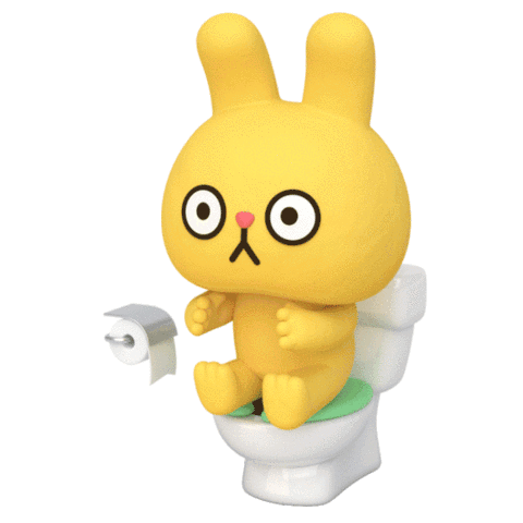 A cute orange and yellow cartoon bunny with big eyes sits on a toilet, next to a roll of toilet paper.