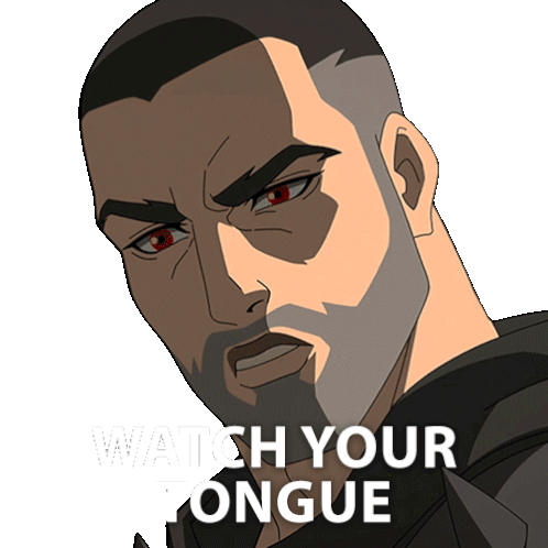 Ares from Blood of Zeus sternly warns, 'Watch your tongue,' with a serious expression and moving mouth.