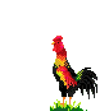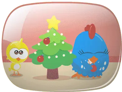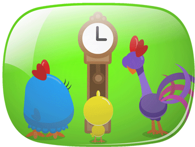 Galinha Pintadinha, the chick, and the rooster watch a grandfather clock tick-tock.