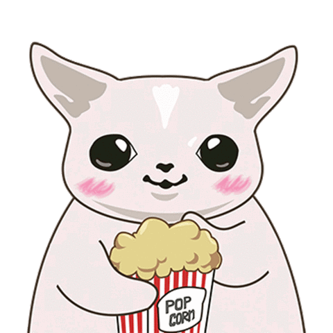 A cute cartoon animal, possibly a chihuahua, happily holding a bucket of popcorn, ready to watch a movie.
