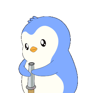A cute pudgy blue and white penguin winks while holding a water hose, seemingly after an accidental splash or 'woops' moment.