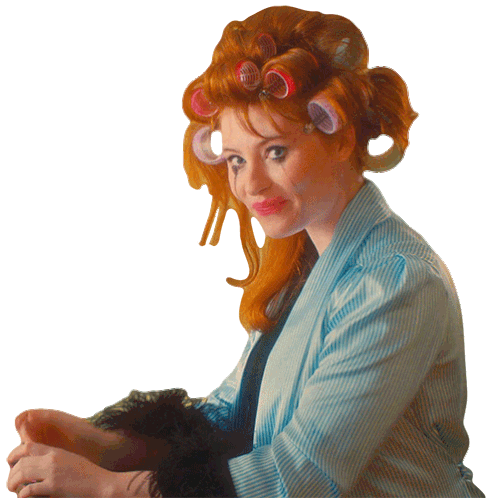 Allison Ponthier waves flirtatiously, smiling with hair curlers and smudged makeup, wearing a striped robe.