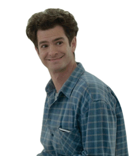 Andrew Garfield as Jon Larson from Tick, Tick... Boom! smiles and waves hello in a blue plaid shirt.