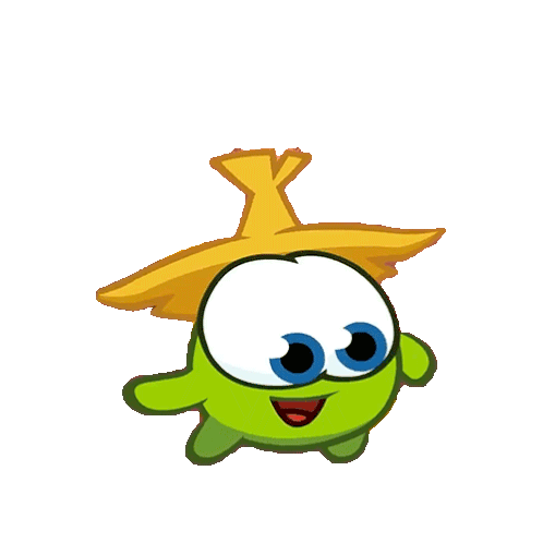 Nibble Nom, the adorable character from Cut the Rope, happily waves goodbye with a cheerful expression.